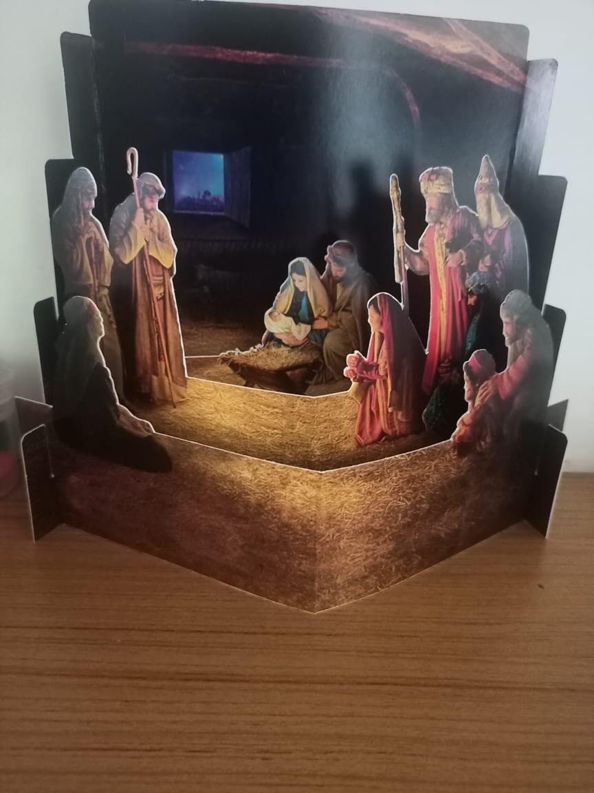 Each layer of this exquisite Nativity paper diorama unfolds the sacred story with graceful depth and artistry. The front layer reveals the humble wooden stable, softly lit and textured with golden straw, drawing the eye toward the heart of the scene. At the center, Mary cradles Baby Jesus in her arms while Joseph watches protectively beside her — a tender portrayal of peace and divine love. Surrounding them, the shepherds stand in reverence, their humble presence symbolizing faith and devotion. Behind them, the three wise men approach with gifts of gold, frankincense, and myrrh, their rich robes and gestures adding a touch of regal warmth. Completing the tableau, a deep night sky forms the backdrop, illuminated by the radiant Star of Bethlehem — the guiding light that completes this timeless moment of wonder.